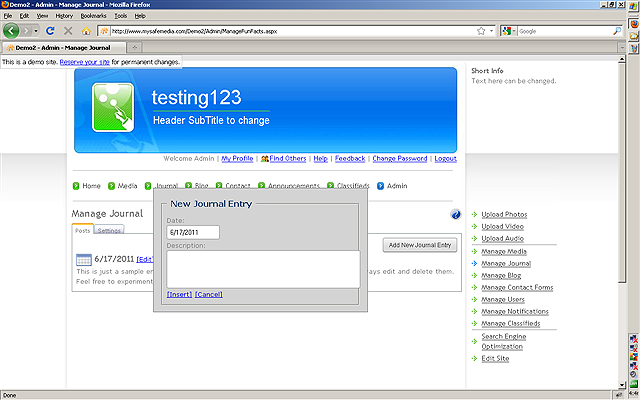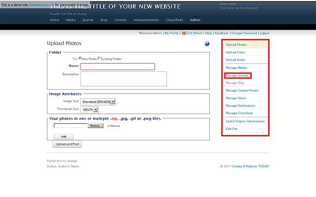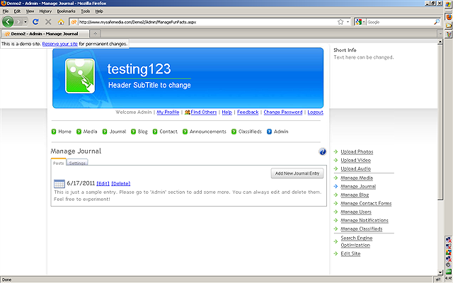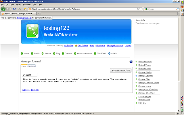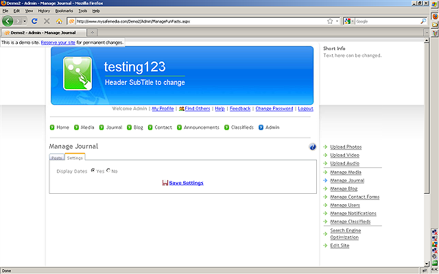 be used as a Diary, FAQ, Journal or Note Pad on your website. Click the MANAGE JOURNAL